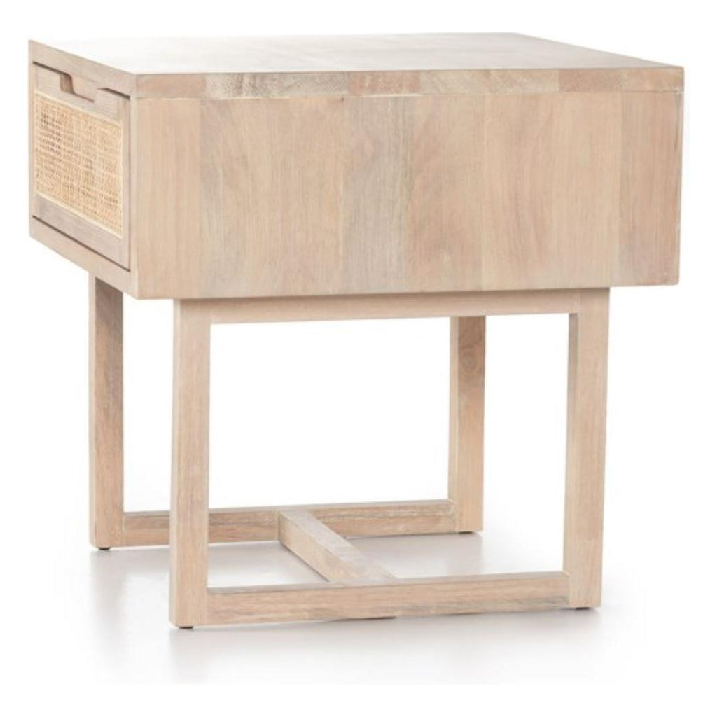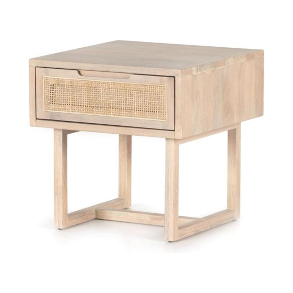 Mid century-spirited while beautifully on trend. A texture-rich end table of white-washed mango features a cane-covered drawer front, for texture and storage alike.