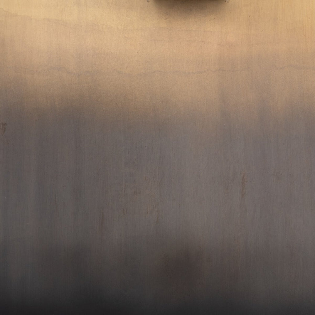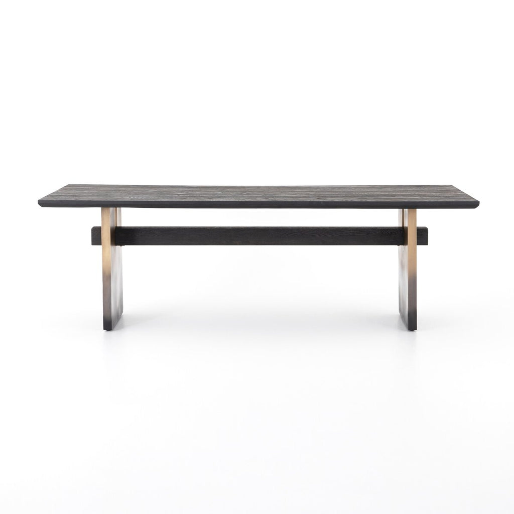Wide, plank-style legs of brass-finished stainless steel feature an ombre pattern for eye-catching effect, with an intersecting beam adding intrigue. A rectangular black oak tabletop flaunts its materials' natural graining, for a richly organic takeaway.